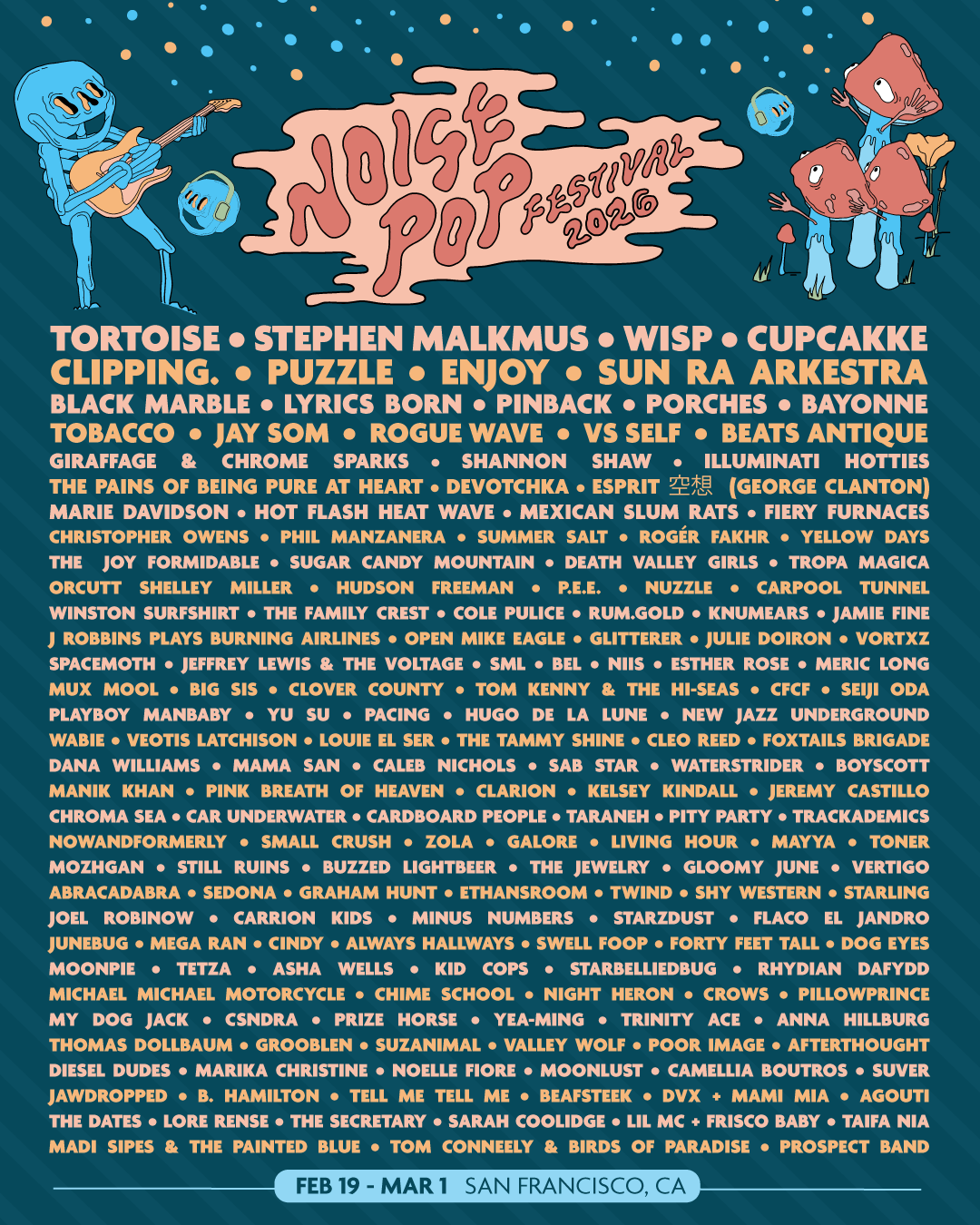 Noise Pop Festival returns February 19th - March 1st 2026! After 33 years of championing independent arts and culture, Noise Pop Festival has since blossomed into a 11 day, 160+ band, 80+ event, 25+ venue music and arts festival that remains a staple in the San Francisco Bay Area. One of the last of its kind - Noise Pop Festival is a true celebration of independent music and arts.